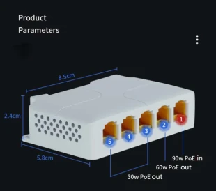 GEMBIRD POE-EXT-14G 5 port, 1000mbpsPOE extender, 30/60W 8W/port, POE voltage 44-57Vdc, 100m, 802.3af/at