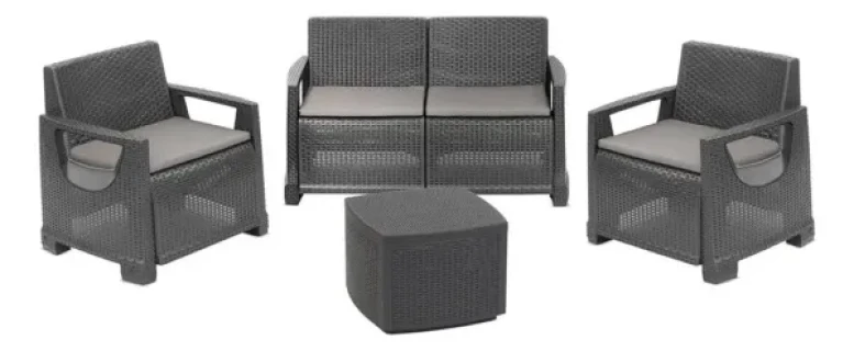 | Opis | - Četvorodelni plastični set, dve stolice, sofa, sto, ratan stil, sa četiri jastuka, udoban, prijatan za sedenje, ergonomski naslon - Dimenzija dvoseda: 129x66x74 cm - Dimenzija stola: 53x53x40 cm |