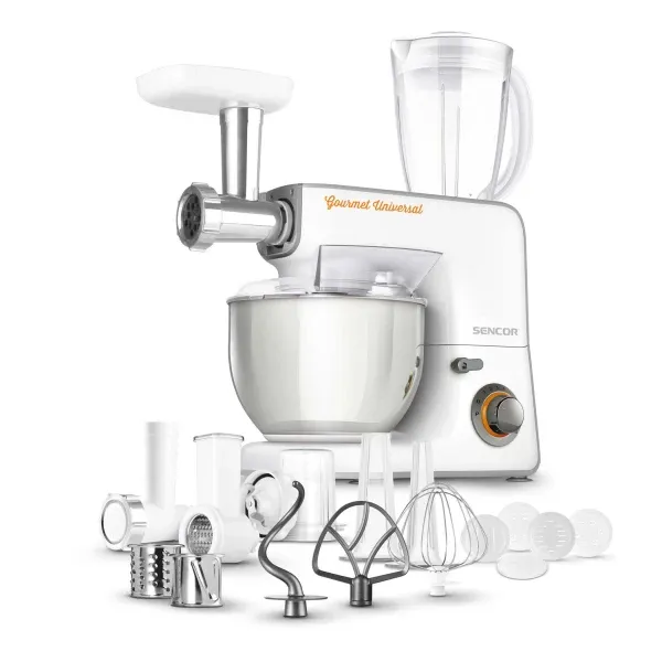 Ja sam višenamenski Sencor multipraktik sa 18 dodataka. Mogu savršeno da uradim svaki posao u kuhinji i osim toga štedim puno prostora! Dakle, ja mogu da zamenim više kuhinjskih uređaja. Imam tri izlazne konstrukcije, zahvaljujući kojima mogu mnogo toga da uradim. Mešam, brišem, oblikujem, mućkam, blendiram, režem, sečem, meljem i mešam i tople i hladne sastojke. Imam deset brzina i pulsni prekidač za maksimalnu brzinu za obavljanje svih ovih funkcija. Opremljen sam bajonetnim sistemom za jednostavno sklapanje i zamenu priključaka. Bezbedan sam i za odrasle i za decu. Na maksimalnoj snazi, ne pomeram se sa svog mesta zahvaljujući nožicama sa zaštitom od proklizavanja i bravici za zaključavanje, tako da se ne mogu slučajno pokrenuti u nagnutom položaju. Moja posuda od nerđajućeg čelika zapremine od 5,5 l oduševiće čak i veću porodicu U njoj mogu da umutim do 8 jaja a zahvaljujući svom moćnom motoru mogu da mesim čak i tvrđa testa. Mogu sve da vidim kroz svoj prozirni poklopac, u koji se tokom rada može dodati više sastojaka. Neću zaprljati kuhinju tokom rada, a kao bonus čak ću i zabavljati mlade kuvare. Opremljen sam Planetarnim sistemom za mešenje, mešanje i mućenje Tokom procesa, moja glava se istovremeno okreće u oba smera, stoga garantujem potpuno umešavanje sadržaja posude, bez grudvica. • Široka mutilica - Za mućenje do 8 jaja / 12 belanaca ili pravljenje odličnog šlaga i lagane pavlake. • Kuka za mešenje testa- Mogu da gnječim bilo koju vrstu tvrđeg testa, npr. za hleb, picu ili testeninu. • Uža mutilica - Pažljivo mešam laganija testa i ostavljam dovoljno vazduha u njima, kao i kod ručnog mućkanja. Kao rezultat su tu pite, kolači, kremovi ili prelivi bez premca. Zahvaljujući velikoj snazi od 1000W, nije mi problem da izmešam sve što mi padne na pamet Do 1,5 l različitih vrsta supa, kaša, pirea, smutija, koktela i drobljenog leda. Ako treba da sameljem kafu, iseckam luk ili sameljem orahe, prosto zamenim blender posudom za mlevenje i to je to! Želite li sveže mleveno meso ili kobasicu? I ja sam ponosan na ovu funkciju! Mlinom za meso mogu da pripremim smešu za ćufte, hamburgere ili bolonjez sos. Upotrebom drugih priključaka, mogu da napravim dimljene proizvode u dve veličine, kao što su viršle ili kobasice. Imam tri izmenljiva priključka za rendanje i sečenje na komade Pomoću njih sitno ili grubo rendam i režem kriške za supe i salate. Lako pripremam razno povrće, voće, krompir pa čak i prezle. Na taj način ću ubrzati ceo proces kuvanja od početka do kraja. Ništa se ne može porediti sa ukusom domaće testenine! Toliko volim da pravim testeninu da sam opremljen sa pet priključaka za njihovu pripremu, od špageta do raviola. Nijedna vrsta testa za testeninu mi ne predstavlja problem. Želite li testeninu sa spanaćem, pasuljem, testeninu od celog zrna? Sve što treba da uradim je da izmešam sve sastojke, odaberem priključak i domaća testenina će biti gotova za tren oka. Otkrijte nove horizonte sa višenamenskim priključcima