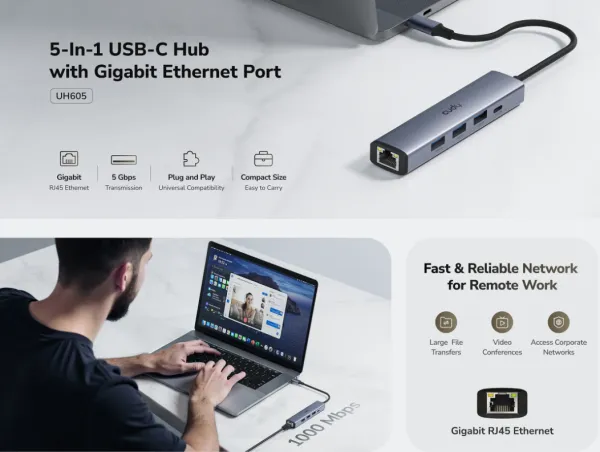 Cudy UH605 1.0,5-In-1 USB-C Hub with Gigabit Ethernet Port,3× USB-A 3.2 Gen 1 (5 Gbps),25cm